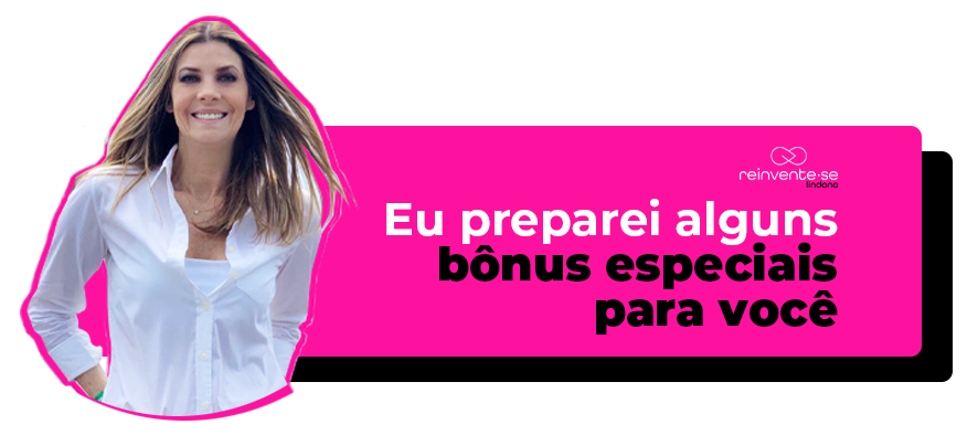 Os Bônus vão ser liberados após a última aula, para você primeiro se dedicar a sua reinvenção e depois aumentar seus resultados com as estratégias e conhecimentos que você vai aprender em cada um deles.